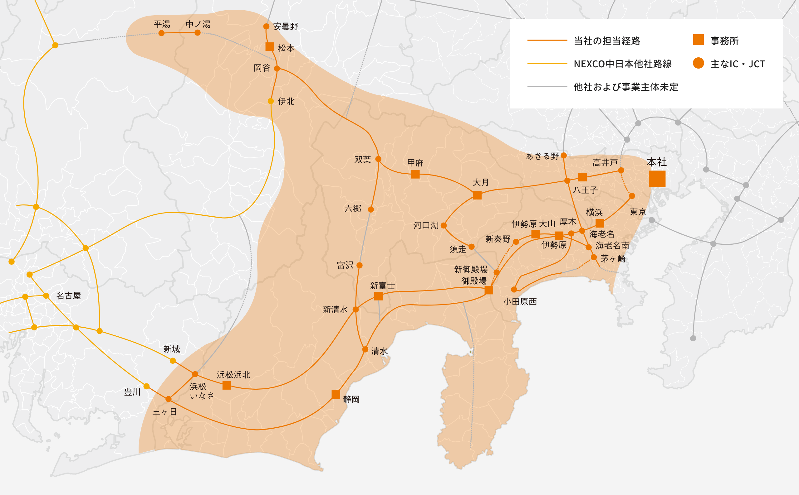エンジ東京の事業エリアは東京都、神奈川県、静岡県、山梨県、長野県におよびます。地域によって異なる地形・気候・環境の中、多種多様な構造物や施設・設備の保全に努めています。