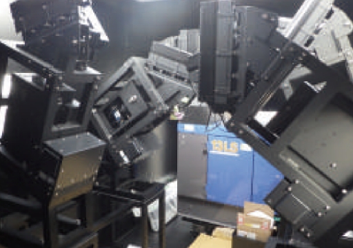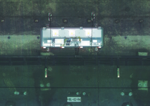 - 8KカラーラインカメラとLED照明を固定し、カメラの撮像範囲に安定した照度の光を照射。下方からの目視が困難な撮影対象の上部を高い位置から影を落とさないように撮像します。