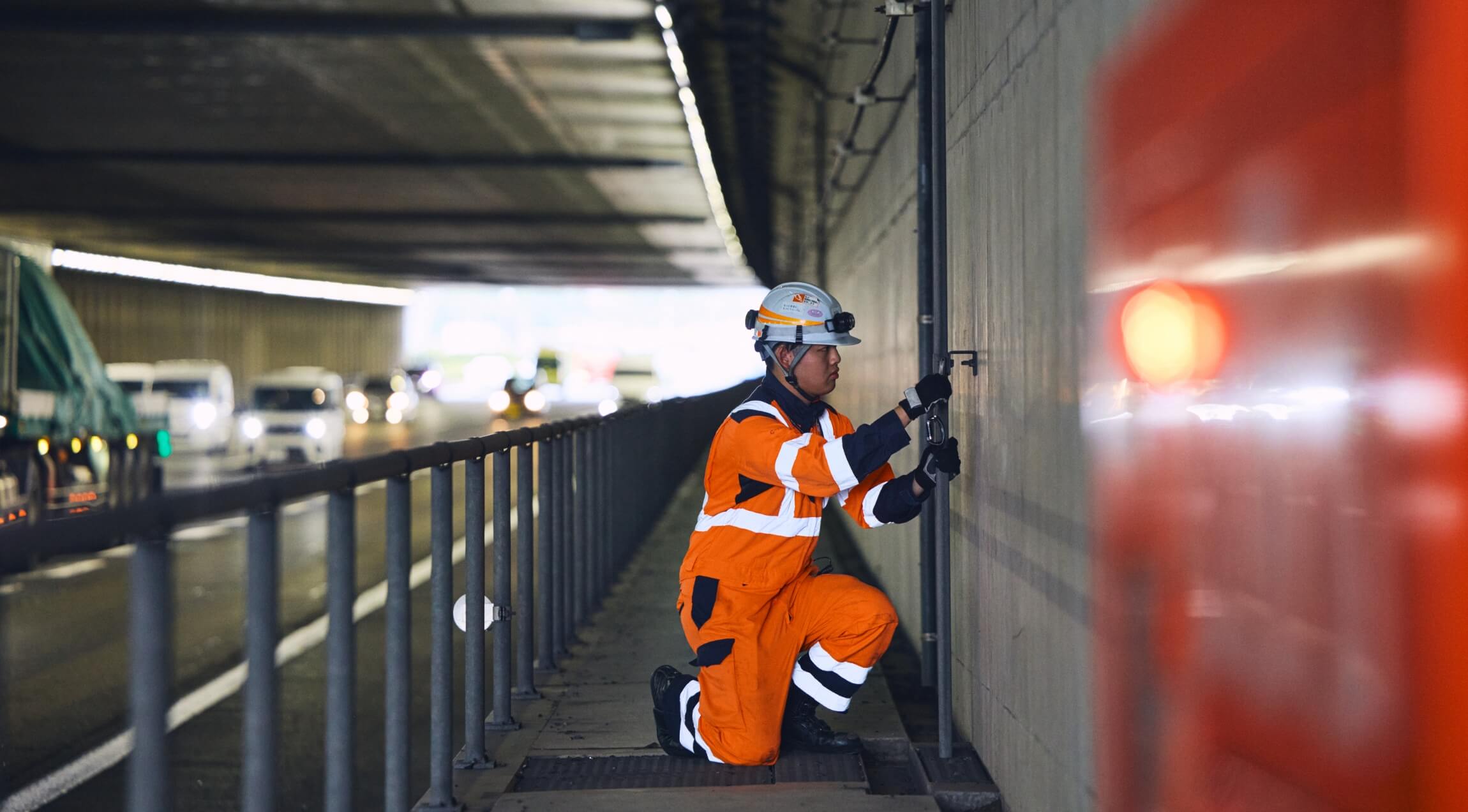 高速道路上にあるさまざまな設備の点検を行っています。道路照明、監視カメラ、情報板、SA・PAに電力を供給する受配電設備、消火栓や避難口といったトンネル非常用設備など扱う設備は多種多様です。設備の外観や作動状況を確認する機能点検のほか、設備の構造的な劣化を調査する構造点検を定期的に行うことでリスクを早期に確実に発見できるよう努めています。自家発電用の大型ディーゼルエンジンやトンネル内換気用のジェットファンなど高速道路の設備はスケールが大きく、普段の生活では目にすることがないものばかり。万が一の事故や火災からお客さまを守る責任の大きい仕事ではありますが、刺激と発見の多いワクワクする毎日を送っています。